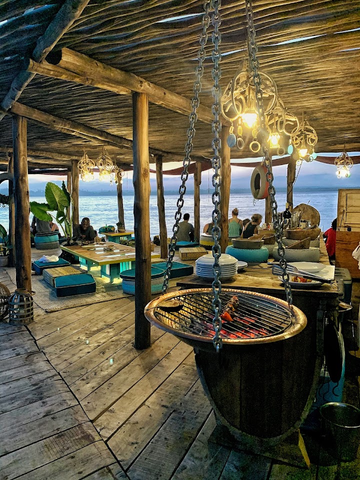 Le sedute sono praticamente a terra fatte di cuscini quadrati ed il tavolino d’appoggio è un ripiano di vetro. Uno dei beachbar più caratteristici, posizione mozzafiato, curato nei minimi particolari... asso nella manica le amache sull'acqua, frequentato da modaioli.